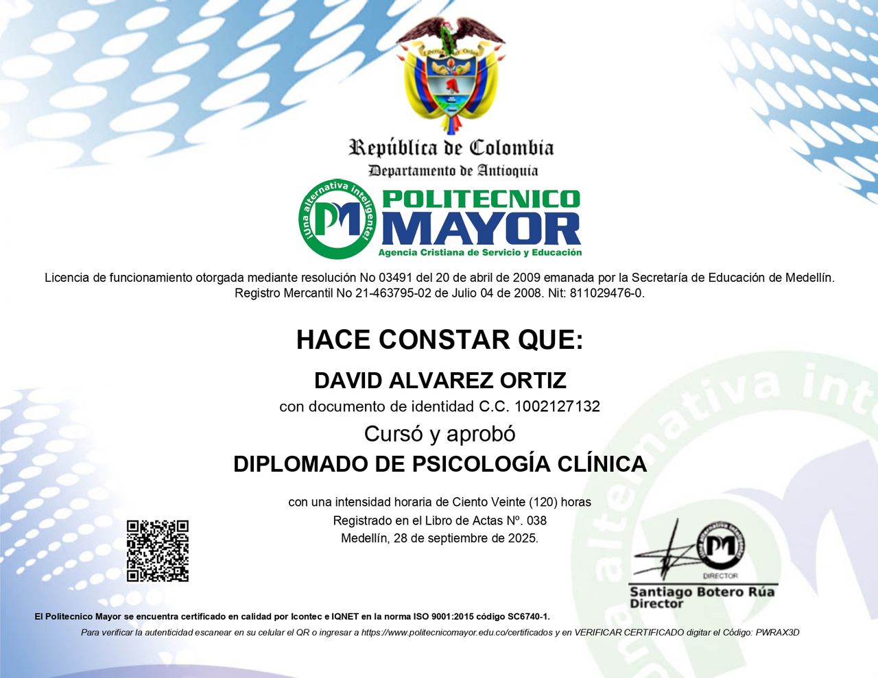 Psicólogo de 26 años con formación y experiencia en diferentes áreas de la psicología, incluyendo investigación, psicología educativa y clínica. He participado en procesos investigativos como auxiliar y representante en RedCOLSI (2023), así como en proyectos dirigidos a la comunidad educativa (Colombo Francés, 2022). En el ámbito clínico, he brindado atención psicológica en consulta particular y en instituciones como el Consultorio Psicológico Popular (2022) y la IPS Universitaria San Buenaventura (2023), acompañando a consultantes en diversos procesos personales.