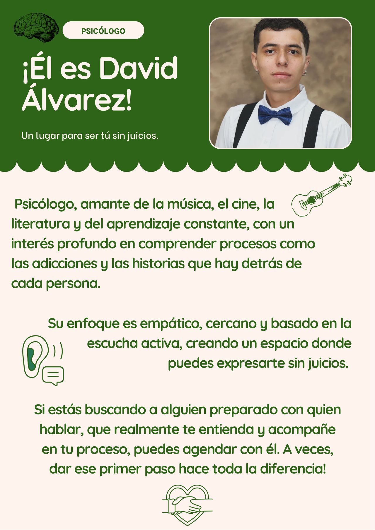 Mi intención es brindarte un espacio para que seas tú sin juicios, acompañándote y apoyándote en tu proceso personal. Si atraviesas un momento que sientes que te sobrepasa, necesitas herramientas y psicoeducación, o sencillamente buscas a alguien preparado con quien hablar y sentirte acompañado, ¡Te invito a agendar conmigo! A veces, ese primer paso lo cambia todo.